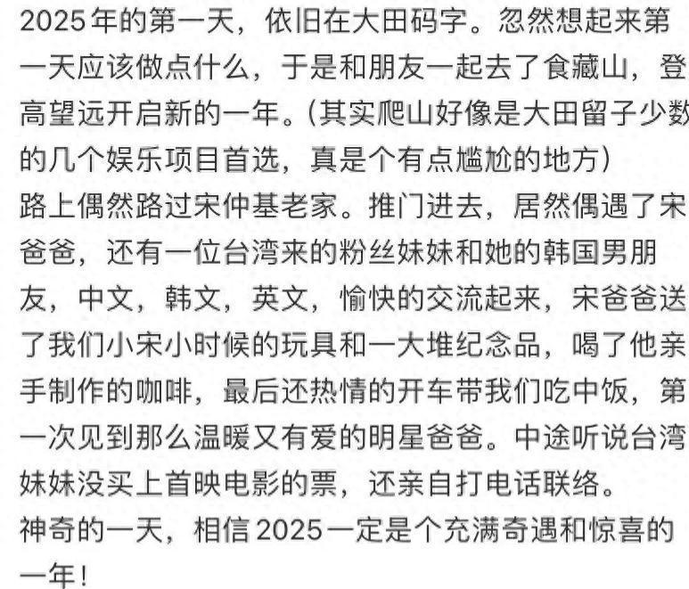 1月5日,有网友共享出到韩国演员宋仲基大田桑梓爬山动态,行运的是网友还偶遭受了宋仲基父亲况且参不雅了宋仲基曾生涯过的场地。