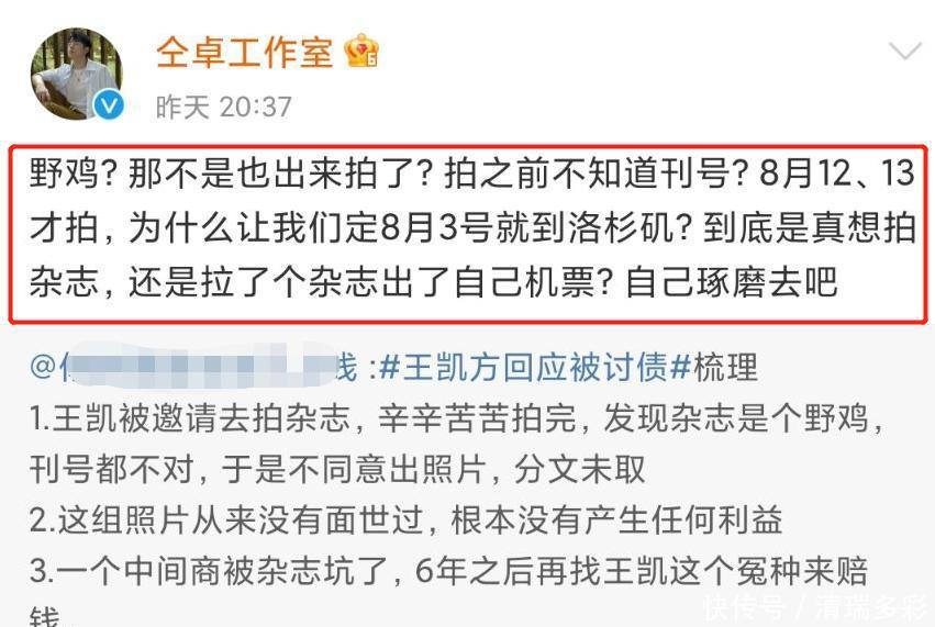 仝卓职责室找仝卓讨帐失败之后,又盯上了演员王凯和照相师高源,但照旧毫无悬念的失败了,因为他讨帐的根由太扯了。 事情是这么的: 8年前,仝卓职责室的现实标的东谈主郭涵,一刹找到王凯本东谈主,说要邀请他给一家香港杂志拍摄创刊封面。
